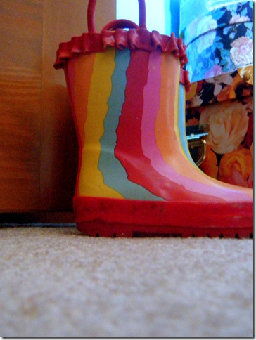 Some final details include the sign from my baby shower fastened to her footboard; Bentley’s perch; rainboots (from Kohl’s) being borrowed for use as a doorstop; and a pine footstool (IKEA) to help the little miss get into bed at night.